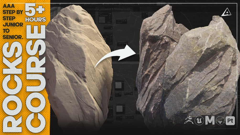 A full, 5+ hour course with source files included on making rocks for games from scratch. Going from reference, sculpting, retopology, unwrapping, MULTIPLE shader creations that suit your rock or project the best, going from simple to advanced, and fully covering mask and texture creation. And that's just scratching the base. This course comes in a format where you decide the pace. Having access to videos showcasing the process in real-time, sped-up, or cutting straight to the info, One thing is for sure: No bullsh*t, no fluff. Just straight-to-the-point content and information, with edits to make viewing pleasure and learning as fun and straightforward as possible.