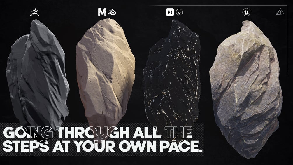 A full, 5+ hour course with source files included on making rocks for games from scratch. Going from reference, sculpting, retopology, unwrapping, MULTIPLE shader creations that suit your rock or project the best, going from simple to advanced, and fully covering mask and texture creation. And that's just scratching the base. This course comes in a format where you decide the pace. Having access to videos showcasing the process in real-time, sped-up, or cutting straight to the info, One thing is for sure: No bullsh*t, no fluff. Just straight-to-the-point content and information, with edits to make viewing pleasure and learning as fun and straightforward as possible.